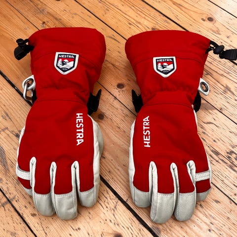 Hestra handske i størrelse 7 med brun yderside og lysere inderside. Handsken har en fleeceforing for ekstra varme og komfort. Designet med justerbar rem ved håndleddet for bedre pasform.