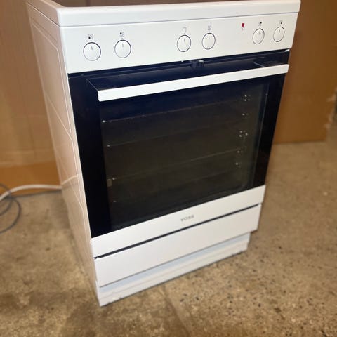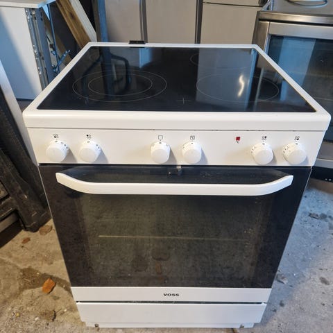 Voss komfur glaskeramiske med 4 kogezone med lys i knapperne varmluft ovn med selvrens magasin skuffe sokkel højde kan justeres fra 85 til 92 cm med kabel så det er klar til at tilslutte pæn og velholdt