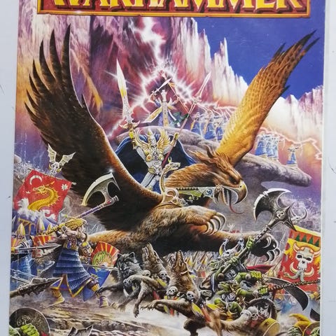 Warhammer Rule Book Spilbog med farverig illustration på forsiden. Indeholder detaljerede regler og retningslinjer for Warhammer spil. Perfekt til fans af strategiske brætspil og samlere.