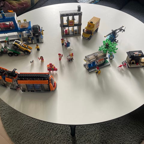 LEGO City byggesæt med forskellige dele og temaer, herunder minifigurer og byggeplader. Sættet indeholder flere manualer og forskellige LEGO-elementer i flere farver og former.
