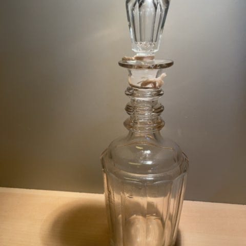 Rød glas karaffel med fire små glas. Karaffel og glas har indgraverede dekorative mønstre. Karaffel har en skade på kanten, som ses på billedet.