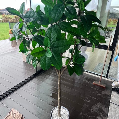 IKEA FEJKA kunstig potteplante med gummifigen, velegnet til både indendørs og udendørs brug. Potteplantens højde er 23 cm.