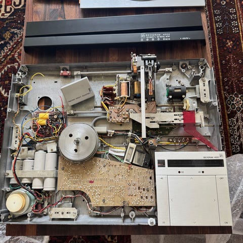 Bang & Olufsen Beogram 4000 pladespiller med integreret dust-off funktion. Enhedens overflade er i metal med en guldtonet finish. Designet til afspilning af vinylplader med hastighedsvalg mellem 33 og 45 omdrejninger pr. minut.