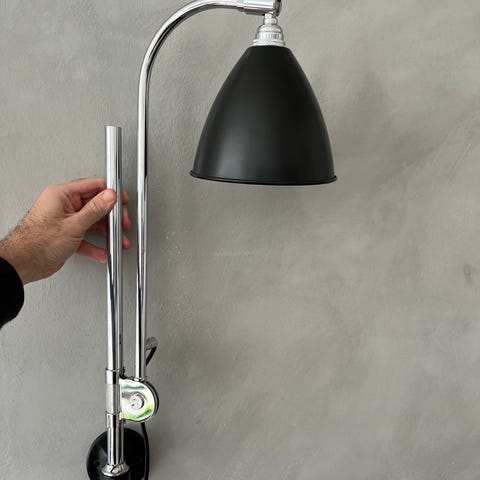 Gubi Bestlite væglampe designet af Robert Dudley Best. Lampen har en beige skærm og en justerbar arm i metal. Den er egnet til vægmontering