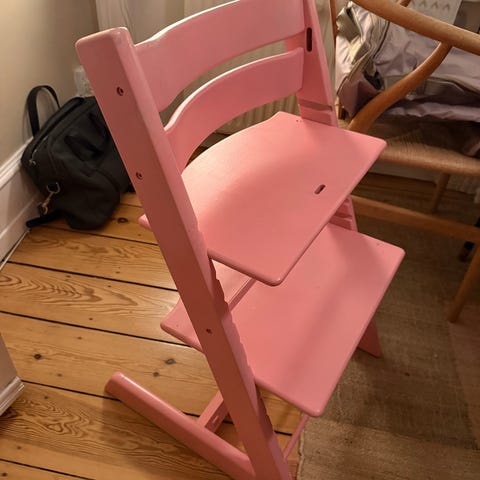 Stokke højstol i blå/tirkis farve. Har enkelte steder hvor malingen er slit af ellers i fin stand.
