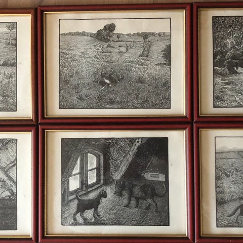 3 billeder, 3 farvetryk fra 1960’erne. Johannes Larsen: Udsigt over Tage i Kerteminde - Vilhelm Kyhn: Dollerup Bakker - Hans Smidt: Jysk Kirke under et optrækkene Uvejr. Originalerne til disse billeder hænger alle på Statens Museum for Kunst. Stammer fra 1960’erne og er forsider af gamle telegrammer trykt på kraftigt papir. Måler 22,5x30cm. Har ikke været oppe at hænge, og er derfor ikke falmede. Een ejer fra røgfrit hjem uden husdyr. Pris pr stk 100kr eller alle 3 for 200kr.