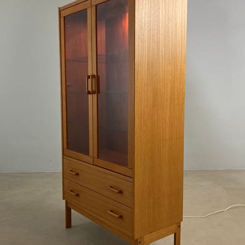 Vitrineskab i teaktræ med to glaslåger, lys og indvendige hylder. Skabet har et klassisk design med buede detaljer på lågerne. Velegnet til opbevaring og fremvisning af glas, porcelæn eller andre dekorative genstande.