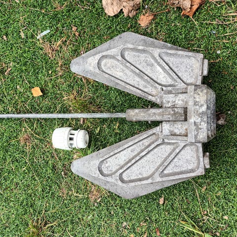 Vinklet arm til hækanker. Armen er totalt 55cm, bredde af beslag mod skrog, 12cm, vinkel cirka 10-15 grader. Fin stand men skal lige pudses op