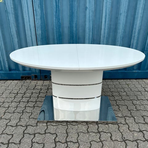 Hvidt ovalt spisebord i corion med 2 udtræksplader. 180/280- 120 cm