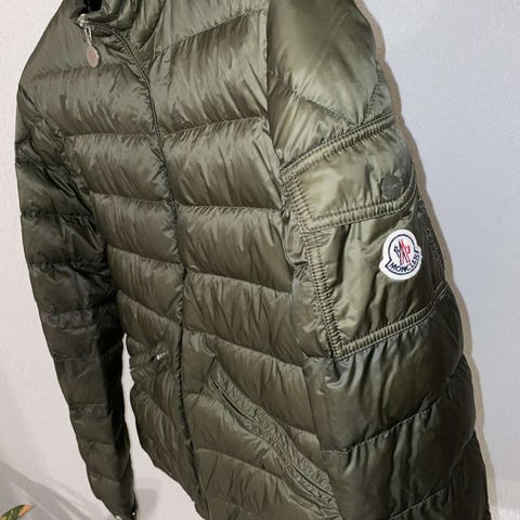 Moncler jakke i størrelse M til herre. Jakken er grøn Designet som en udendørs jakke med hætte og lynlås.