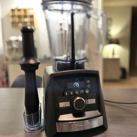 Vitamix blender med digital kontrolpanel og stor beholder i transparent materiale. Blenderen har flere hastighedsindstillinger og er designet til effektiv blendning af ingredienser til smoothies, supper og andre madlavningsopgaver. Er brugt max 50 gange, så hvis du drømmer om det bedste af det bedste, så er den her til dig til en billig pris. Nypris ca. 7000 kr. Kvittering medfølger, og produktet har livstidsgaranti.
