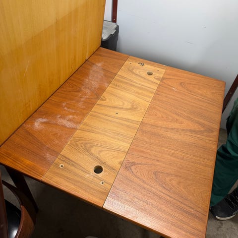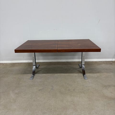 Spidsebord i palisander med hollandske udtræk, samt 5 Sibast nr. 59 spisebordsstole også i palisander. De er betrukket med kunstlæder, som kunne trænge til en ompolstring. Bordet og stole er i god stand, men med brugsspor.