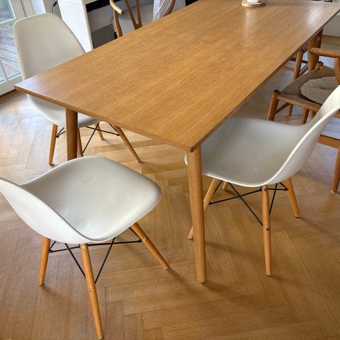 Sælger 4 skalstole i hvid plast, ben i mørkt træ. Det hvide plast på stolene har lidt gullig misfarvning nogle steder. Ikke noget man rigtig ser. Ellers almindelige brugsspor.