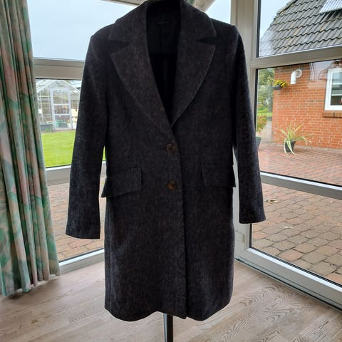 Sort frakke med imiteret pelskrave, som kan knappes af. 30 procent uld. Bælte til. Mange fine detaljer såsom knapper ved ærmer og fint foer. Der står str. 48 i frakken, men tror det er en fejl. Vil mene den svarer til en 38. Den sidder til i livet, figursyet . Fin stand. Meget lidt brugt. Mærke: Sisley. Røgfrit hjem.