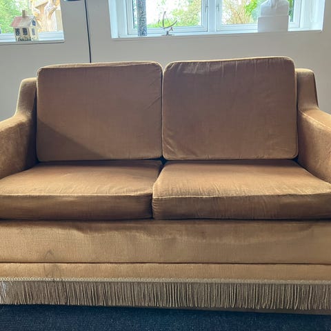 2-personers sofa i mørkegrøn velour med ben i messinglook.
