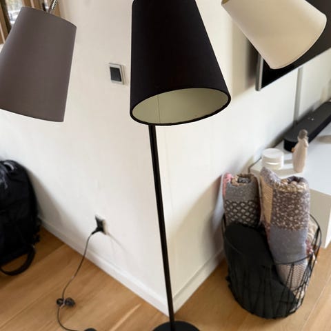 Gulvlampe med 3 sorte skærme og fleksible arme.