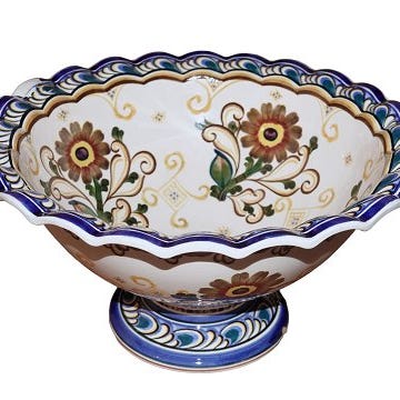 Dekorativ frugtskål med gennembrudt kant. Måler 26 cm i diameter og 15 cm i højden.