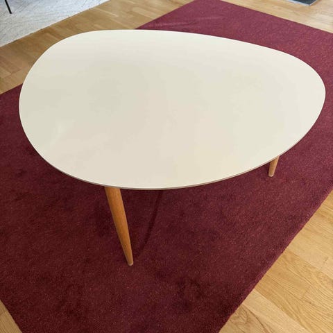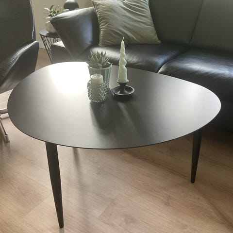 Sofabordet på billedet er et dansk-designet bord med en holdbar laminatbordplade og massive egetræskanter samt ben, hvilket er karakteristisk for moderne nordisk design.