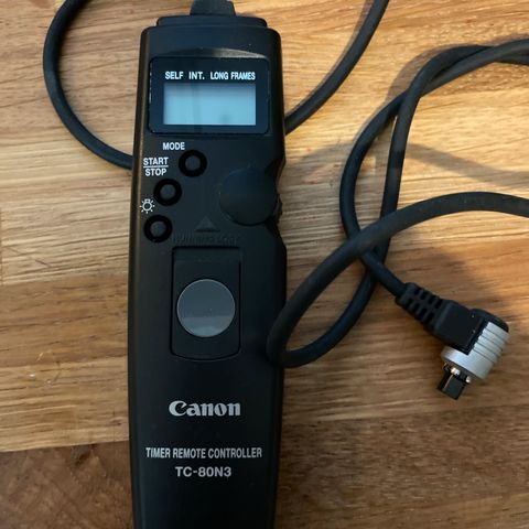 Canon TC-80N3 fjernudløser med kabel til styring af kameraudløsning. Enheden har flere knapper til betjening og er designet til at forbinde med kompatible Canon kameraer via N3-stik.