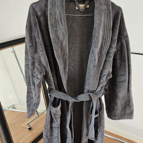 Badekåbe i blå farve lavet af bomuld, størrelse XL til herre. Modellen har lange ærmer, to lommer foran og bælte til at binde i taljen. I kraftig bomuld.