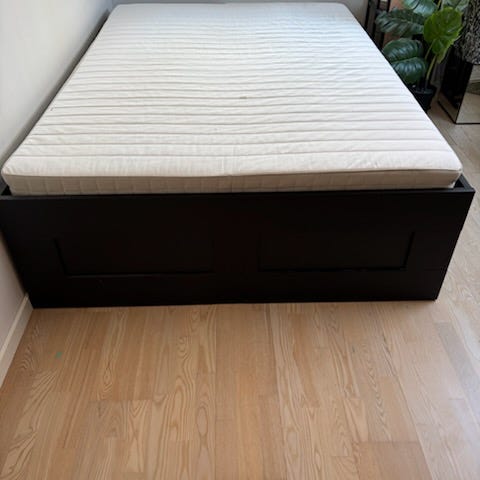 IKEA Brimnes seng (140x200) i hvid med hvidt sengegavl. Fin stand. En enkelt skuffe (den højre på billedet) står lidt skævt, men fungerer upåklageligt. Enkelt metalspærre under madrassen er løs.
