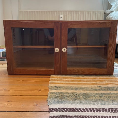 Mdieskab.. Møblet har to skydelåger med flettet front og åbne hylder i midten. Fremstillet i lyst træ med en enkel og funktionel opbygning.