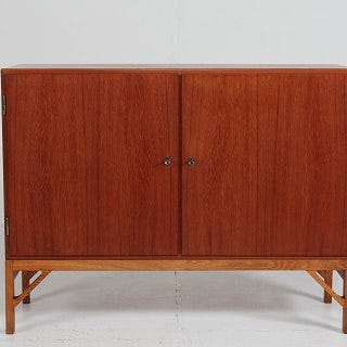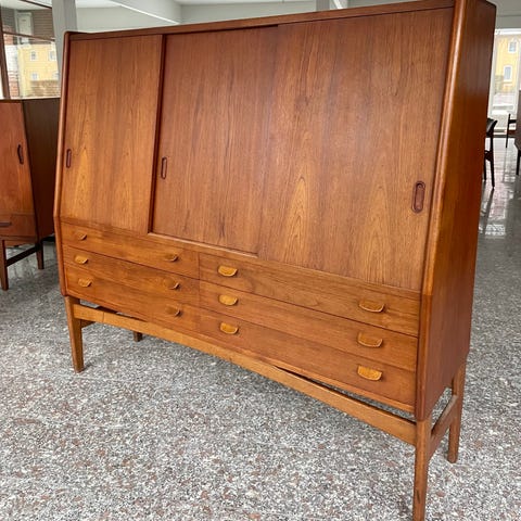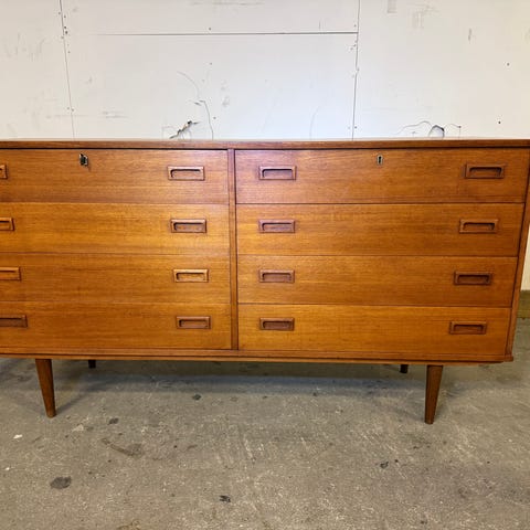 Høj skænk af teak. Front med tre låger, bag hvilke hylder og bestikbakker, tre skuffer forneden. Nøglehul og beslag i messing. Nøgle medfølger. H. 135 D. 44 B. 134 cm. Fremstår utrolig flot og faktisk uden slidtage på nær et skjolder på topplade se billeder. Tegnet af Poul Volther for FDB.