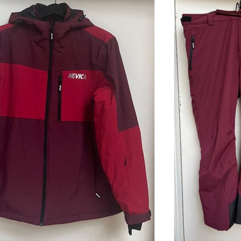 Jakken er størrelse L og bukserne har vi både i str. M og XL. (Der følger kun ét par bukser med)