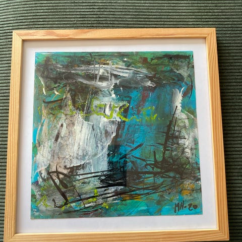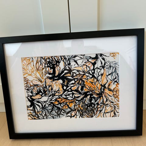 Billedet er monteret i en træramme med ophængstråd på bagsiden.