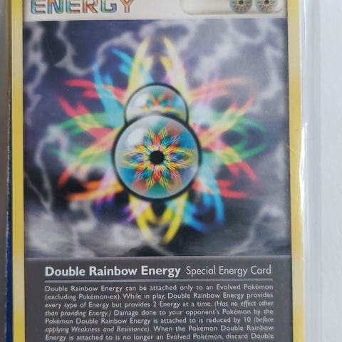 Pokémon Double Turbo Energy samlekort med holografisk effekt. Kortet anvendes i Pokémon-kortspillet som energikort til at understøtte spillets mekanik. Kortets design indeholder to energisymboler og har en bagside med Pokémon-logo.