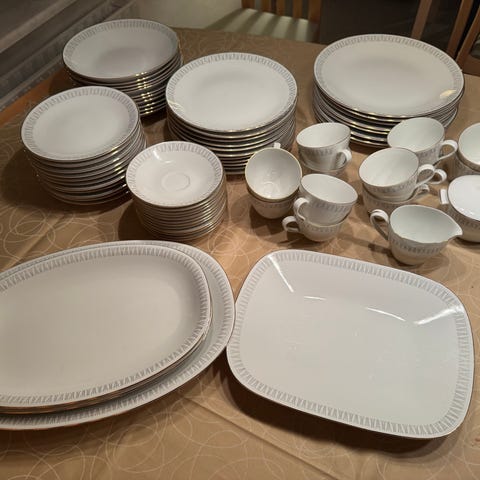 Rörstrand porcelænssæt bestående af tallerkener, kopper, fade og tilbehør i porcelæn. Sættet indeholder forskellige størrelser og former.