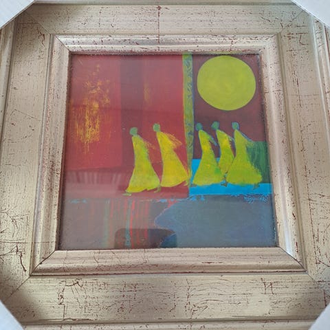 2 stk farverige billeder i trærammer m. "guld/sølv" patina look, 24,5cm, uåbnet