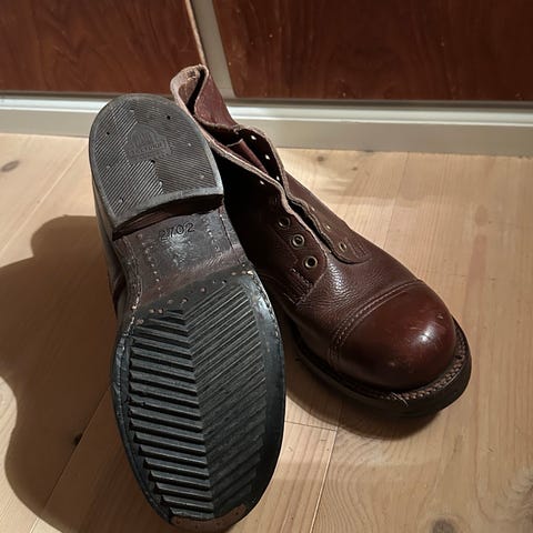 M58 støvler fra dansk militær i 80'erne - 90'erne i størrelse 45. Støvlerne er sorte og har snørebånd. Sålene har slidspor, men støvlerne er generelt i brugbar stand. Næsten nye hælkapper:)