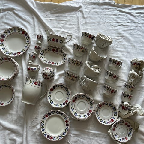 Engelsk spisestel, navn ’Eternal Beau’, til 12 personer i alt 69 dele med fade, sovsekander mv fra Johnson Bro’s sælges.