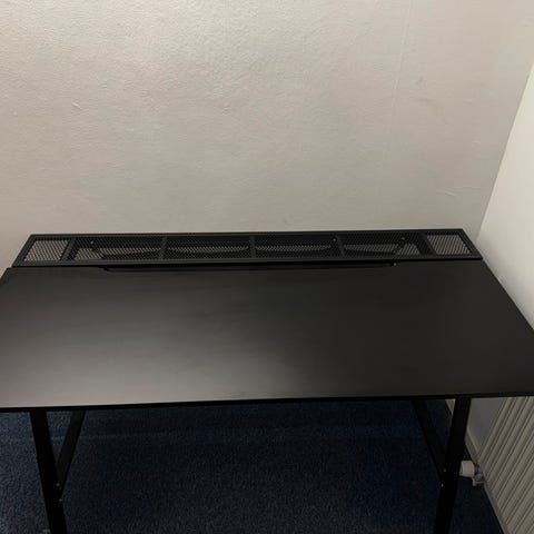 Bordet står meget stabilt og kan nemt tilpasses i højden, så det passer til både kontorstol eller anden arbejdsstilling. God plads til flere skærme og arbejdsudstyr.