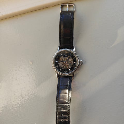 Skeleton herreur med sort rem og gennemsigtig urskive, der viser urets mekaniske indre. Velegnet til mænd, der ønsker et unikt og stilfuldt ur med synlige tandhjul og detaljer.