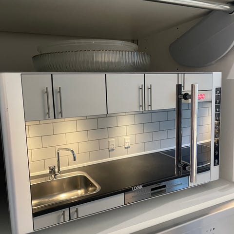 Logik mikrobølgeovn i hvid farve. Betjenes med drejeknapper til tidsindstilling og effektvalg. Designet til opvarmning og optøning af mad.