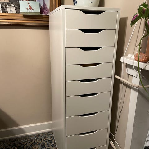 IKEA designeren er Johanna Asshoff! Opbevaringsskab med 9 skuffer. Skabet er hvidt og designet til opbevaring af mindre genstande. Mål: 116 cm i højden, 48 cm i bredden og 36 cm i dybden.