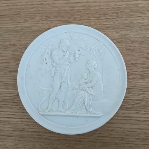 Bing & Grøndahl rundt vægrelief i hvid porcelæn med motiv af en engel. Vægreliefet har en diameter på cirka 20 cm og er egnet til vægophæng som dekorativt element.