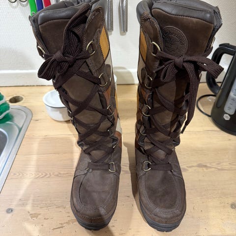 Timberland vinterstøvler i størrelse 38. Støvler har en robust sål og isolerende materiale for varme og komfort. Farven på støvlerne er brun, og de har snørelukning og foring indvendigt.