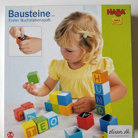 Et unikt og charmerende sæt originale HABA træbyggeklodser, komplet med den klassiske blå og gule trækasse. Dette er et ægte vintage fund med masser af historie.