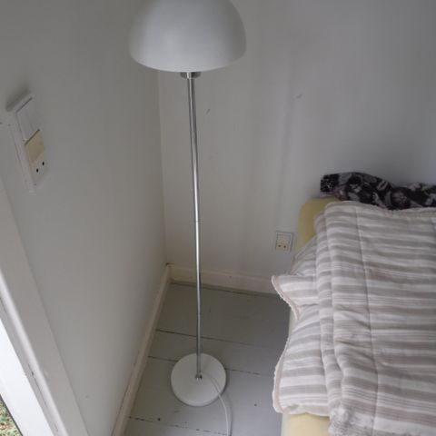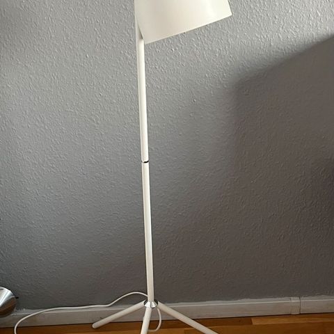 Gulvlampe med hvid skærm og metalfod