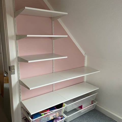 Ikeas boaxel reolsystem i rigtig fin stand. Tre fag. 6 hylder, 1 trådhylde, 8 skuffer, 1 tøjstang.