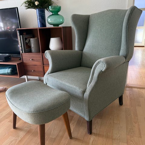 lænestol med tilhørende skammel, begge med betræk i uldlook. Designet med buede armlæn i træ og polstret sæde og ryg. Velegnet til afslapning i stue eller læsehjørne.