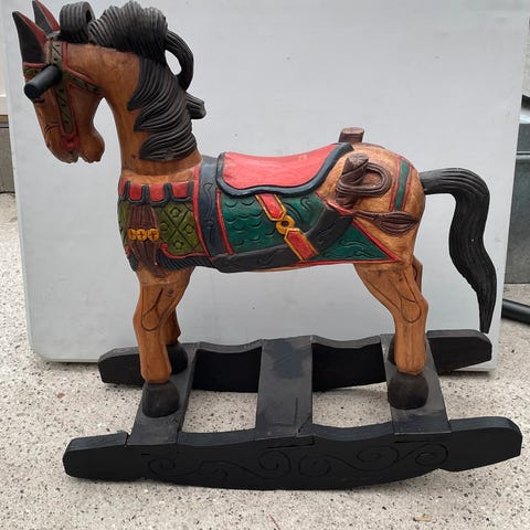 Træhesten er dekoreret med malede blomster. Materialet er træ. Sættet kan anvendes til dekoration, som samlerobjekter eller til at ride på for børn