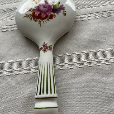 Sættet med håndspejlet, kammen, børsten og klædebørsten er lavet i sølvplet. Alle dele er udsmykket med en eller flere fine roser.