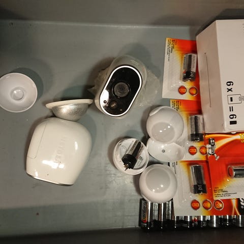 Arlo VMB4540 er en netværkskomponent designet til brug i overvågningssystemer. Den har en sort farve og leveres med tilhørende strømforsyning og kabler. Enheden understøtter tilslutning via USB og andre porte til netværksintegration.