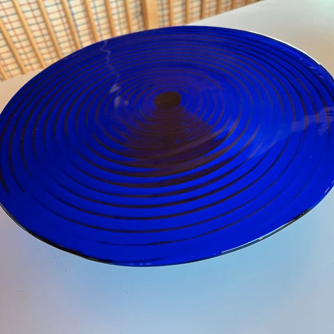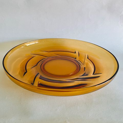 Glat overside, dekoreret ruflet bagside; Iced glass m. spiralform. Stort glasfad med lav kant, ideelt lagkagefad, kagefad, serveringsfad, frugtfad, glasfad lagkagefad frugtfad tærtefad kanapeer ostefad glasskulptur bordfad