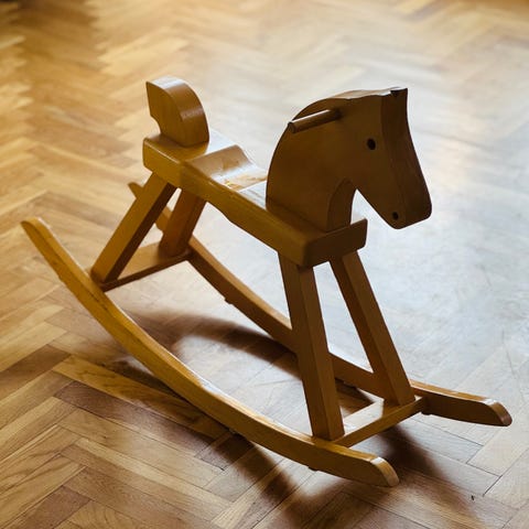 Den klassiske Kay Bøjesen gyngehest i lakeret bøg. Flot stand med næsten ingen brugsspor - se bl.a fotos af sæde og hoved. Højde 56 cm Bredde 86 cm