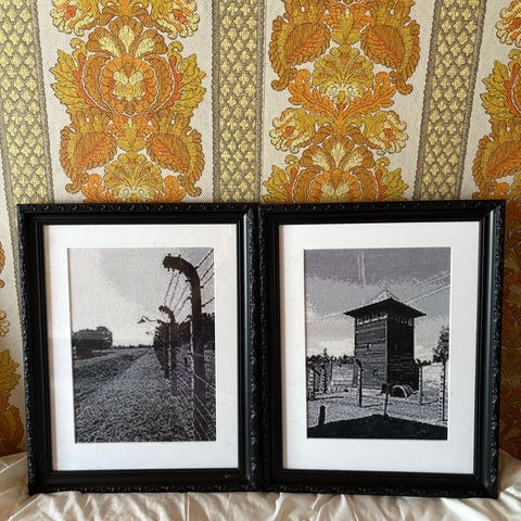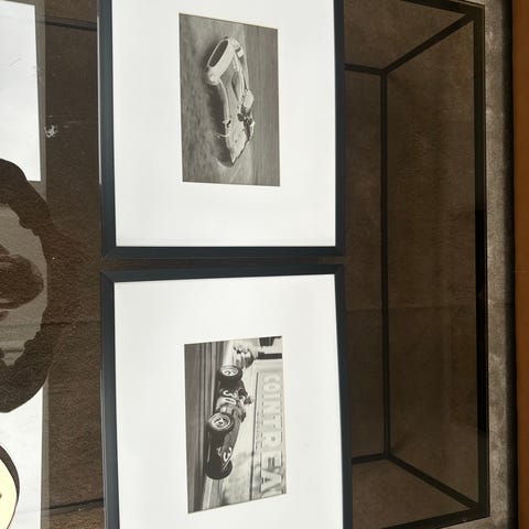 Sort-hvide fotografier med motiver af strand, mole, træ og fyrtårn i sorte rammer. Fire forskellige billeder med naturlige landskabsmotiver i kvadratisk og rektangulært format.